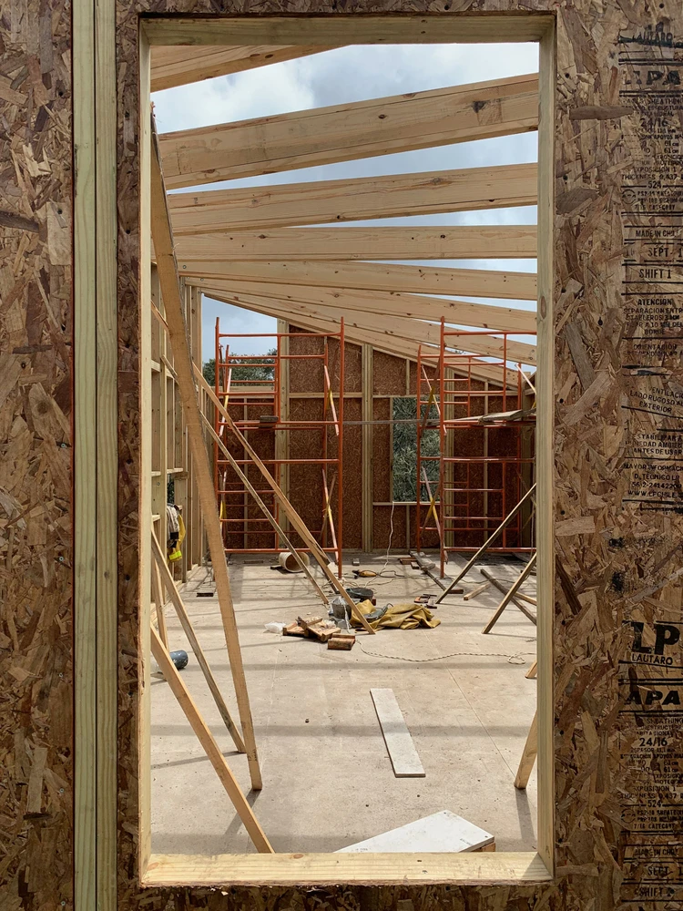 Sobre estas columnas se instaló una estructura de pórticos prefabricados en madera. Estos son amarrados por medio de un sistema de muros y cubierta en OSB estructural creando un sistema de pórticos amarrados por diafragma, el cual le da propiedades estructurales a la piel de la casa.
