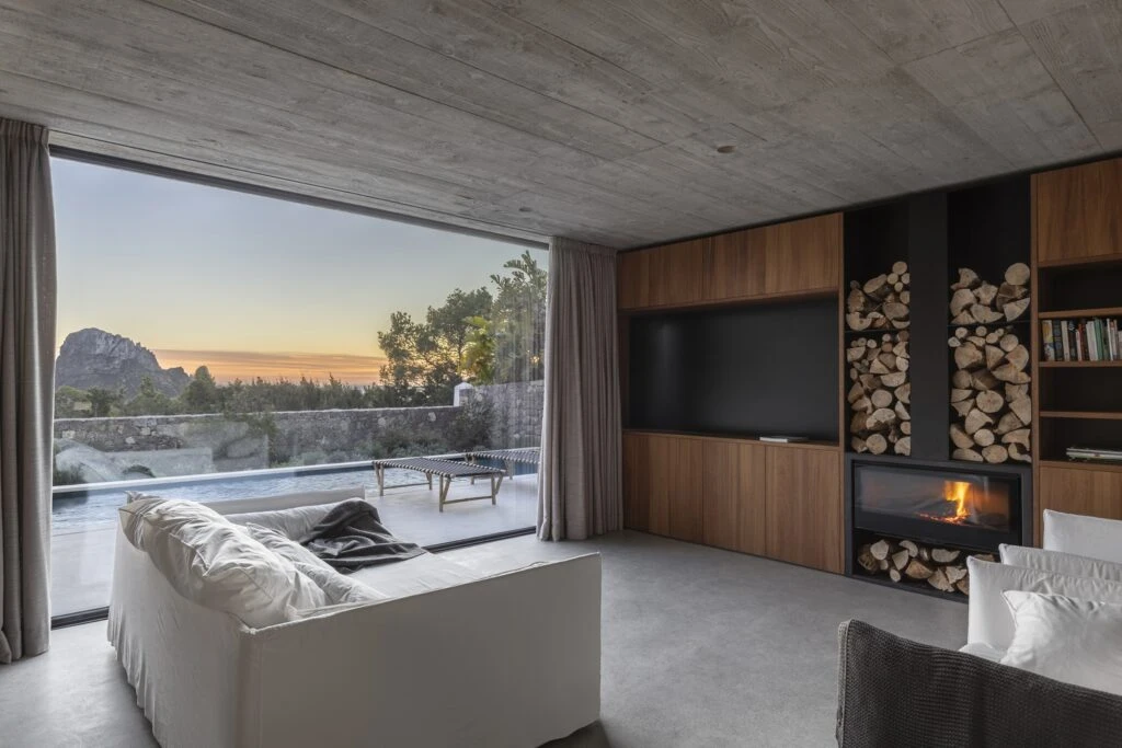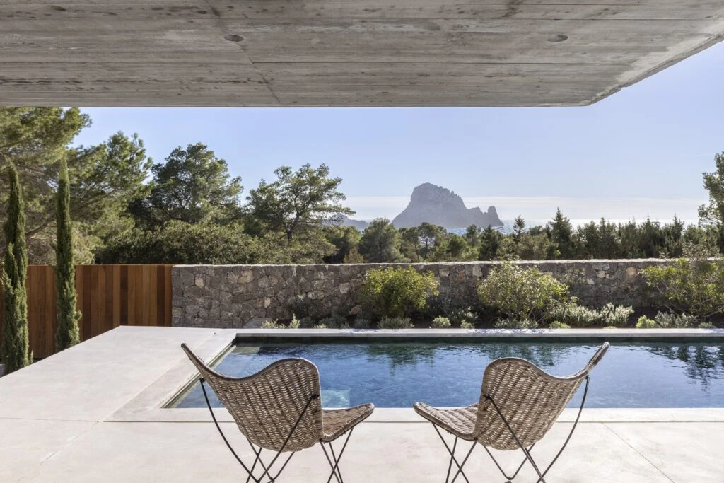 Esta lujosa casa de piedra y hormigón tiene 222 m2 totales y se ubica en el privilegiado entorno de Cala Carbó, en el sudoeste de la isla de Ibiza.