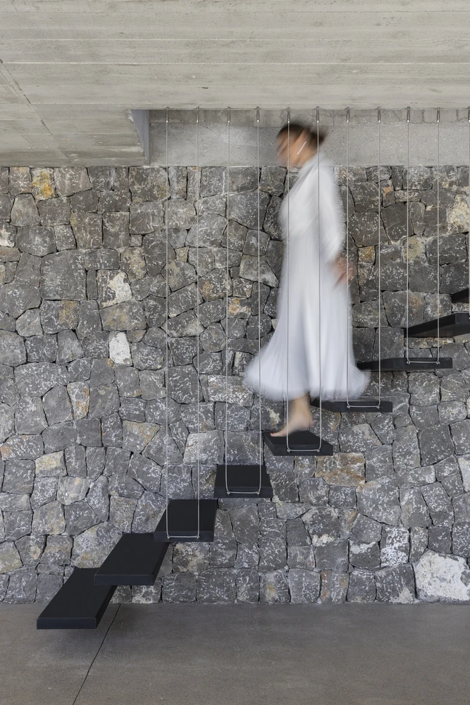 El volumen de la planta primera queda como una “caja” de hormigón que parece flotar sobre la piedra.