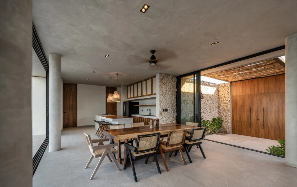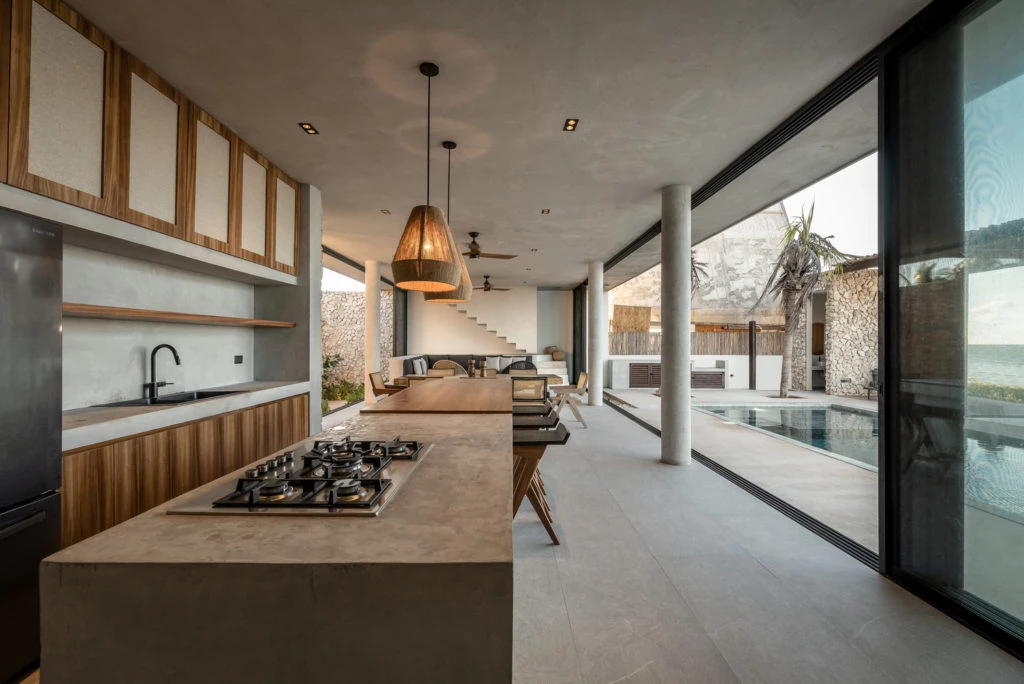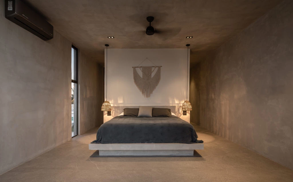 Los tonos grises del interior del proyecto se combinan con la madera, las fibras naturales y la iluminación cálida, creando ambientes sencillos, al mejor estilo wabi sabi, que invitan a la relajación dentro de esta casa de playa.