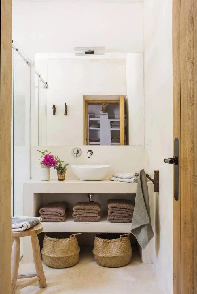 El baño en suite de la casa propone el mismo estilo de decoración que el resto de los ambientes. Sin embargo, tiene paredes y pisos de cemento pulido en color beige suave. La madera y las fibras naturales también se hacen presentes en este espacio y marcan la diferencia.
