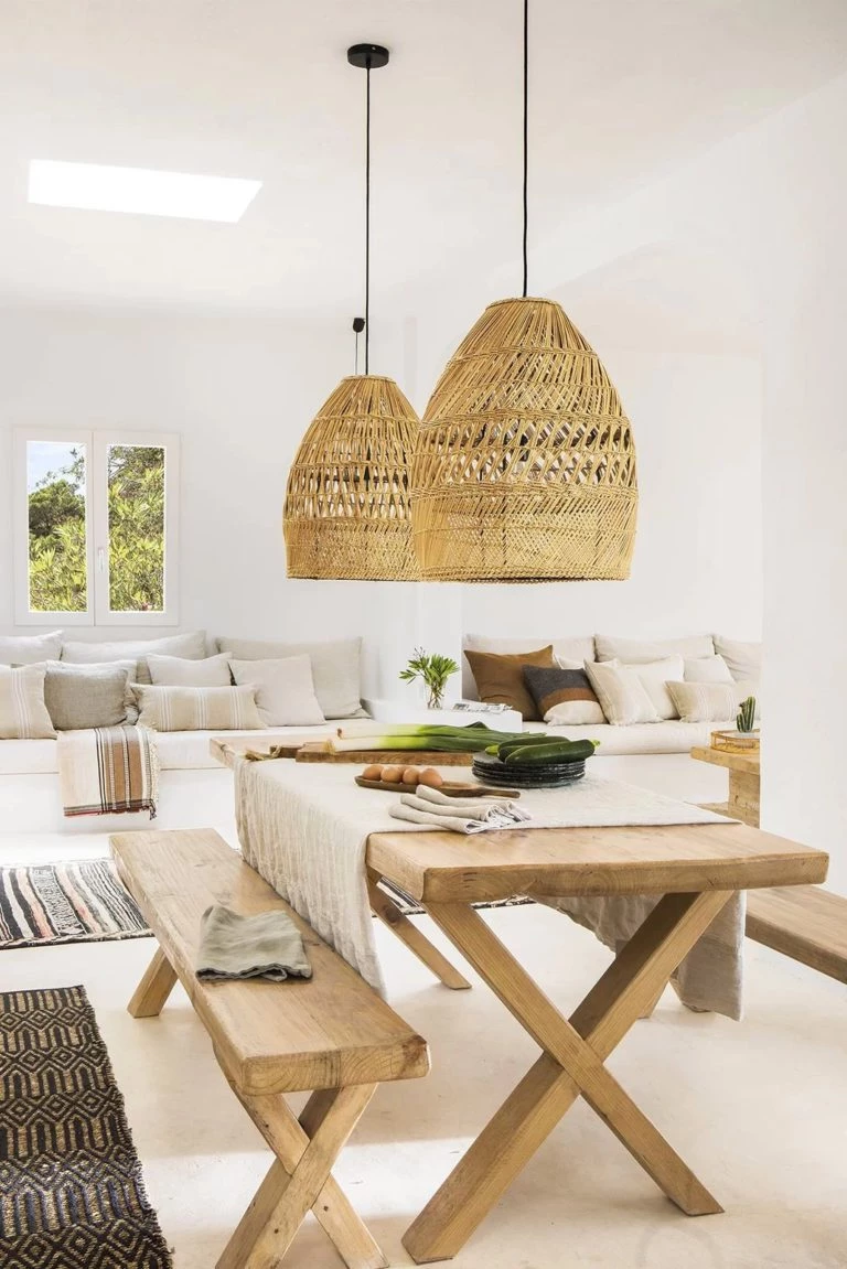 Por su parte, el comedor, es bien relajado con una mesa y bancos sin respaldo de madera clara. Dos grandes lámparas de fibras naturales sobrevuelan sobre ella y resaltan por sí solas.