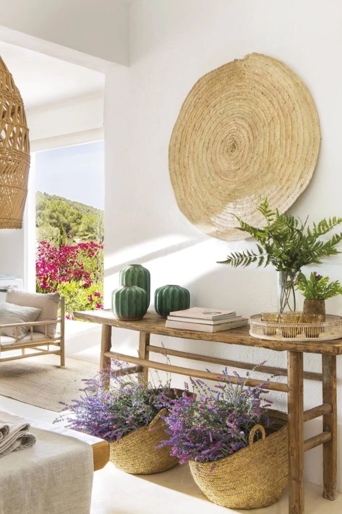 Tiene una mesa alta de madera natural sin pulir y diferentes adornos y accesorios que marcan la diferencia, como una alfombra de fibra natural en la pared y dos cestos de mimbre con lavandas recién cortadas que suman color y perfuman el espacio. Y lo mejor de todo, ¡es que fue improvisado a último momento!