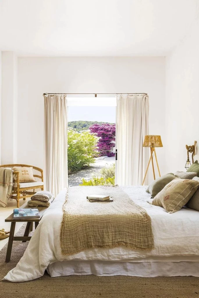 El dormitorio principal está pintado completamente de blanco y tiene salida directa al exterior. Está equipado con una cama king size, un sillón individual de mimbre, una lámpara de pie con pantalla de yute, y una amplia alfombra de fibras naturales. En este ambiente predominan los tonos tierra.