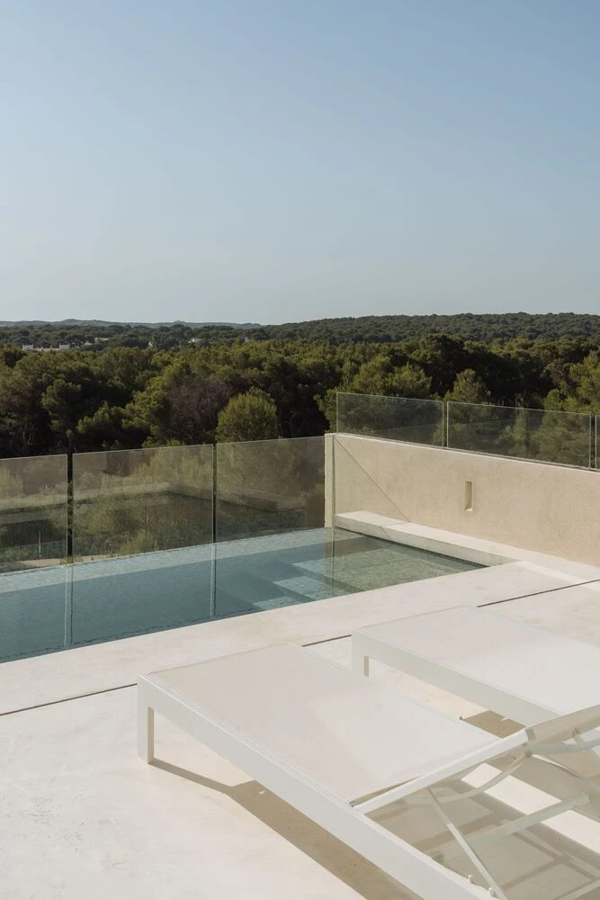 La zona de día se abre a una terraza elevada que se prolonga en una piscina desbordante, todo ello situado en la última planta para garantizar las mejores vistas al mar. Los ventanales continuos garantizan vistas en todas direcciones y mucha luz natural.