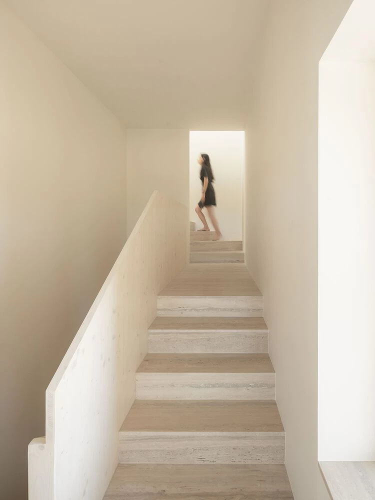 El piso de hormigón blanco pulido y los peldaños de travertino combinan con paredes blancas sencillas, y microcemento color beige en baños y cocina.