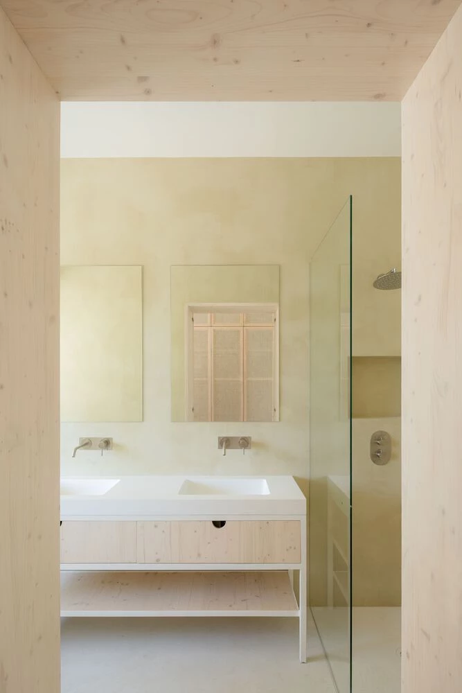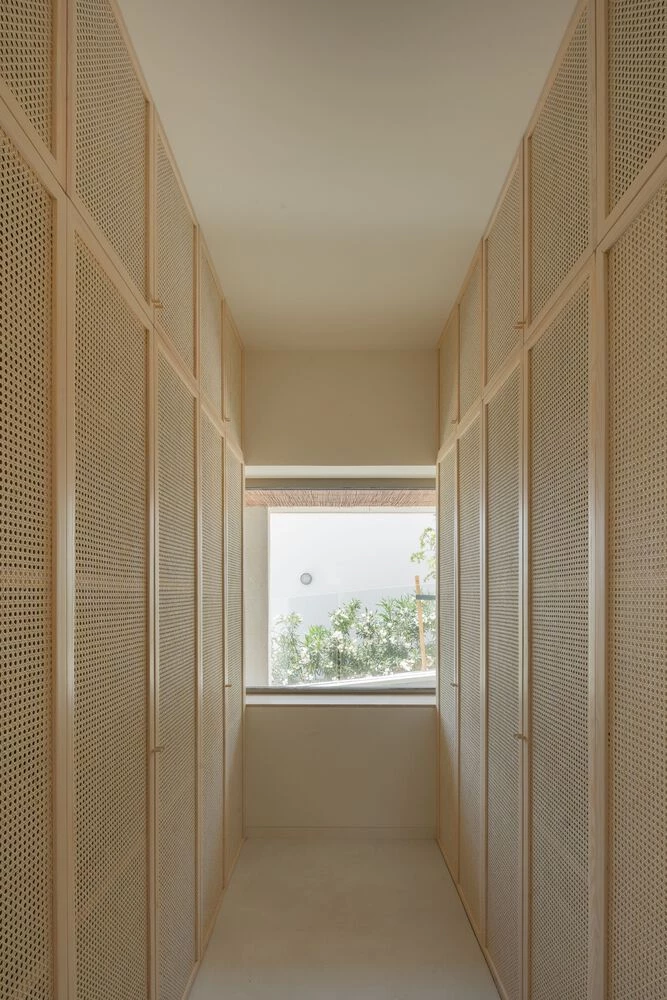 Los armarios empotrados y los muebles de baño fueron diseñados por NOMO STUDIO, con carpintería artesanal de ratán y pino claro.