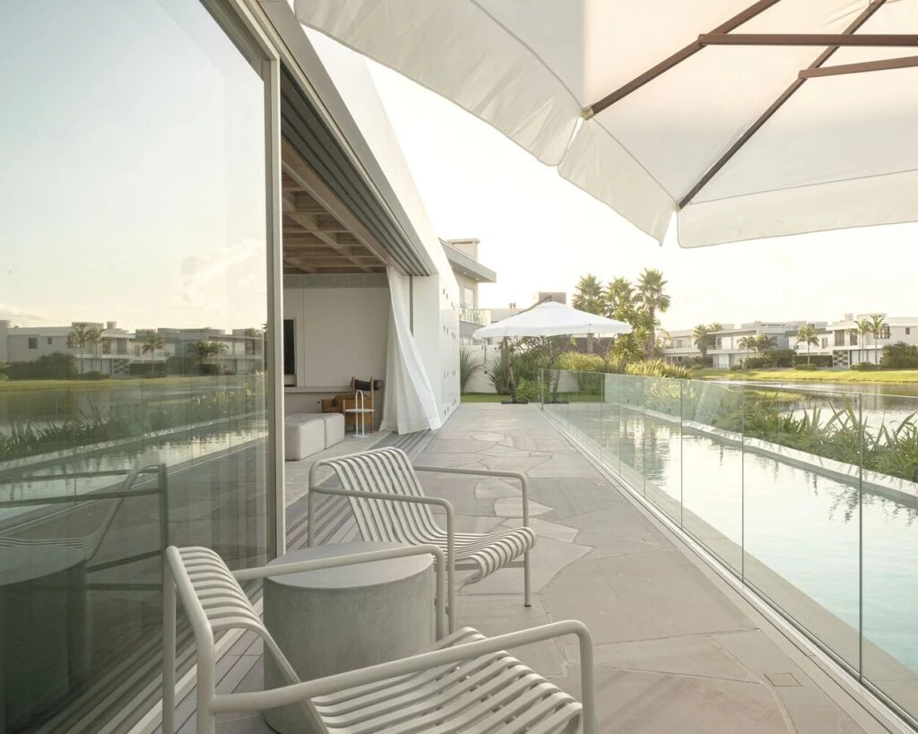La privacidad fue una de las principales preocupaciones del proyecto. Por esta razón, la casa tiene sus áreas sociales y la piscina orientadas hacia la parte trasera del terreno, junto al lago del condominio.
