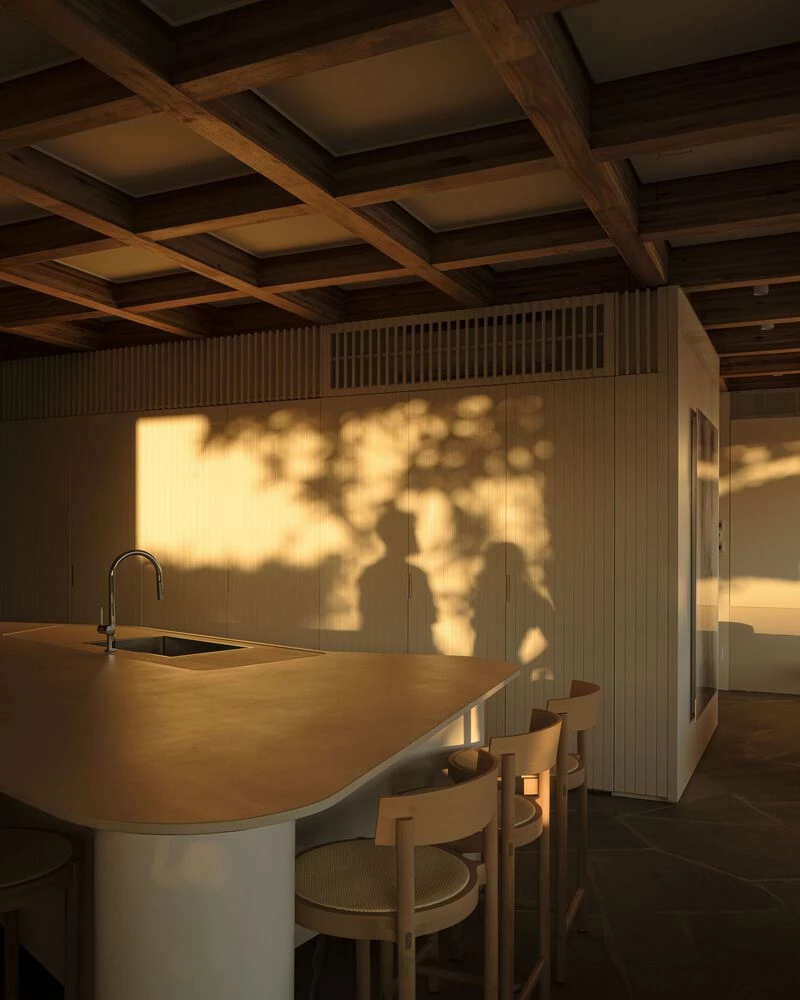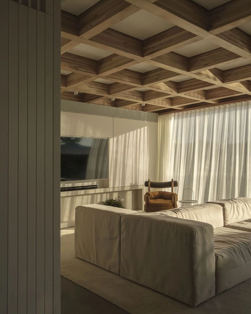 En los interiores, la retícula de madera del techo es la protagonista: todos los elementos compositivos fijos de la distribución (paredes, armarios e iluminación) están alineados por ella. Se hizo hincapié en dejar esta estructura de vigas de madera expuesta en los espacios interiores, con cerramientos de techo blanco solo en los vanos entre ellas, que incluso están visibles en el vano central de la claraboya.