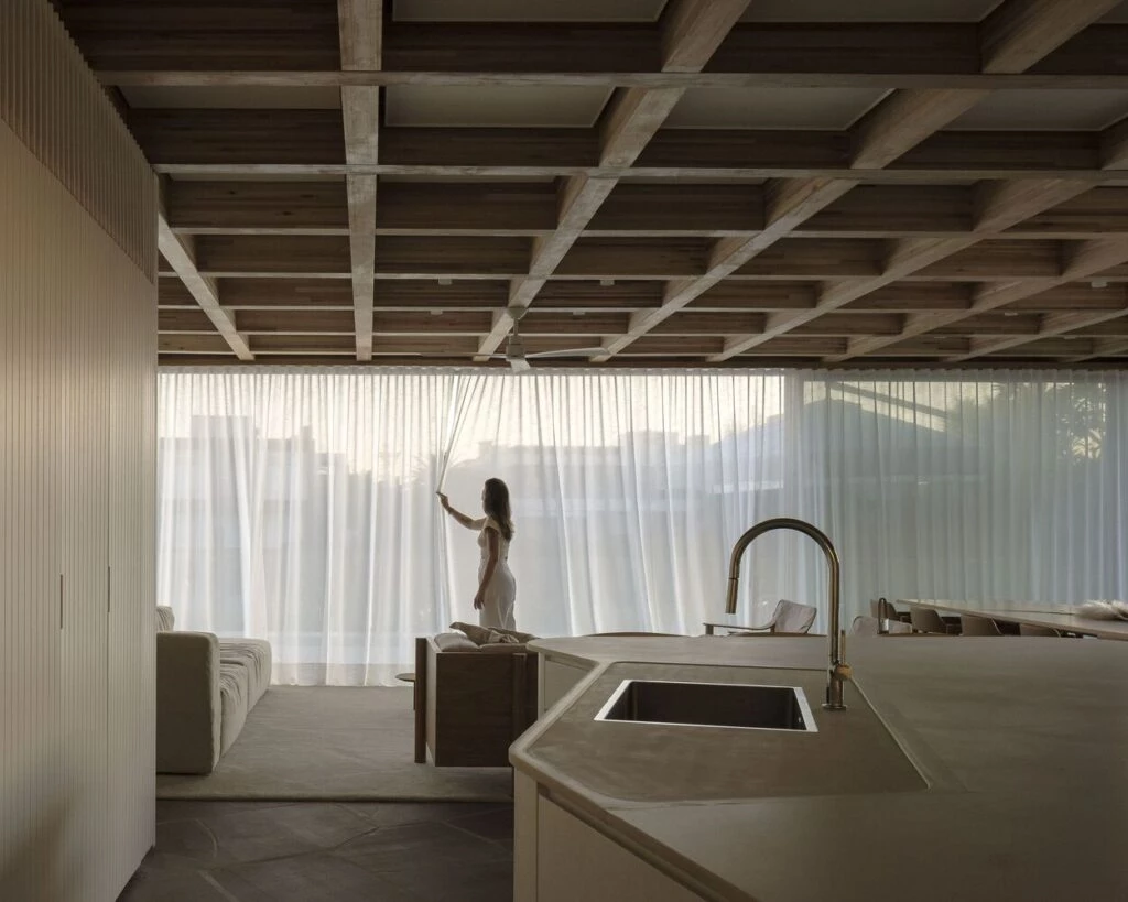 Los colores son suaves y las superficies ricas en texturas, reflejando la sensación exterior de la casa: ligereza y fluidez, invitando a esta familia al descanso y a felices momentos de ocio.