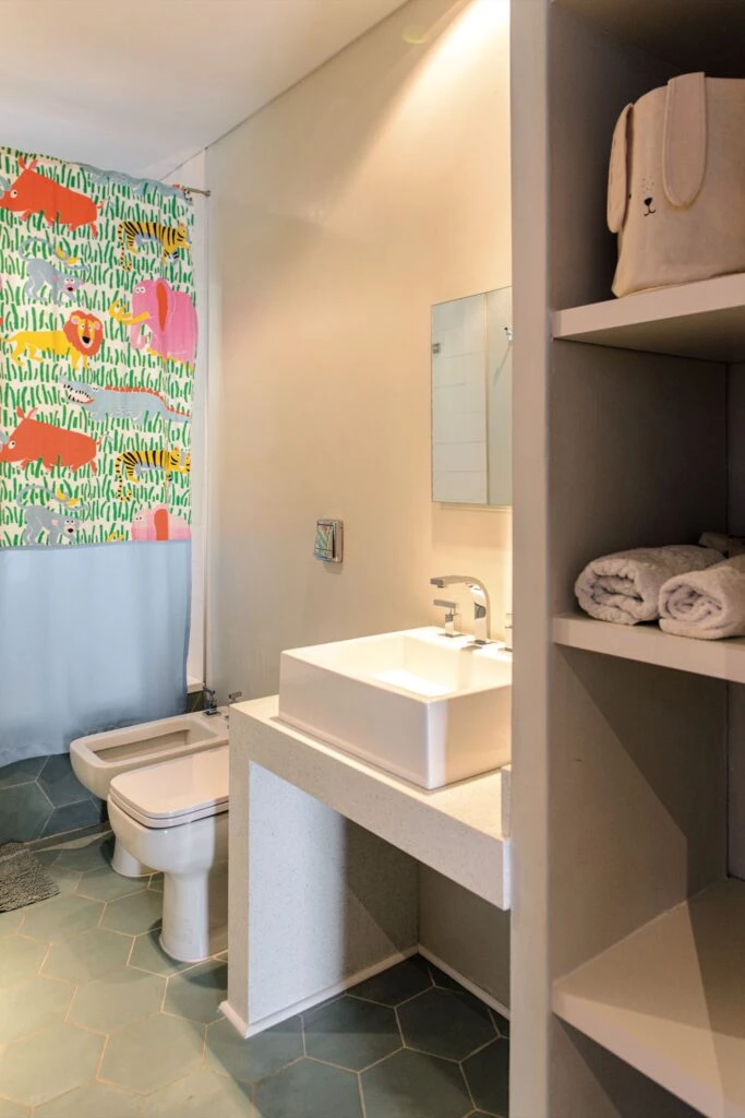 Un baño infantil con pisos (Aquamar, de Cortes) y una cortina de baño reciclada.