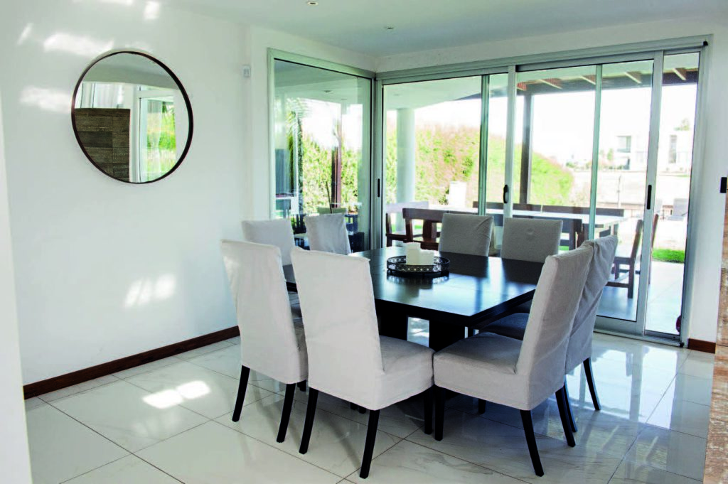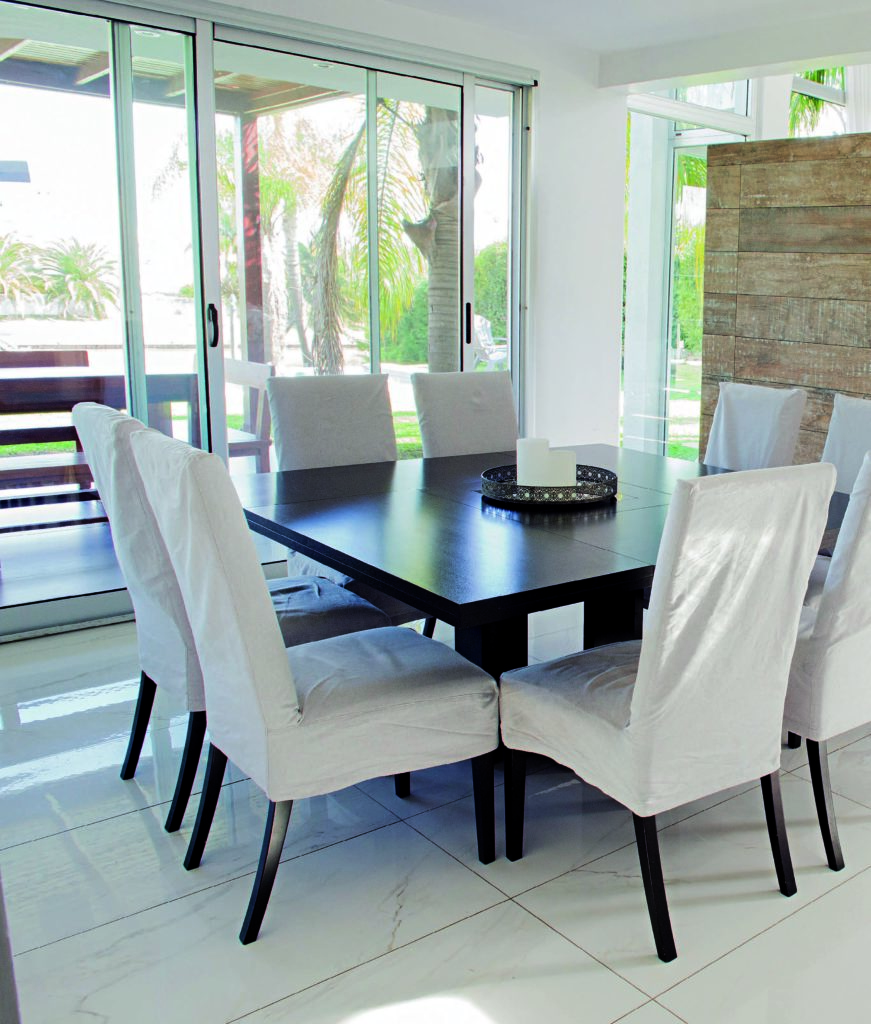 Separado del living por un medio tabique revestido en porcellanato símil madera, el comedor mantiene una estética simple y despojada. La gran mesa cuadrada de madera para ocho comensales protagoniza el ambiente y, en busca de la practicidad absoluta y de simplificar su limpieza, las sillas reciben fundas en Panamá gris plata. Una gran puerta ventana de hoja corrediza comunica el comedor con la galería y permite jugar con la experiencia in-out en ocasiones especiales.