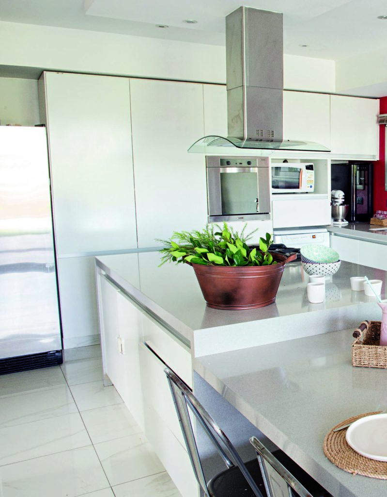 Gracias a la gran isla con tapa de Silestone blanco norte en dos alturas, la cocina funciona también como comedor diario. De un lado, el anafe y la campana extractora modelo Arketto isla (www.spar.com.ar) completan la zona de cocción junto con la doble bacha, el microondas y el horno empotrado.