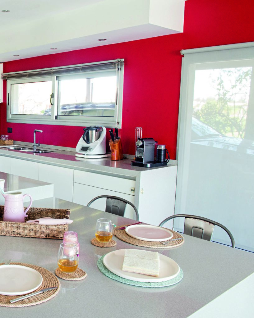 Del otro lado, un gran mesón extiende la superficie de apoyo y oficia de mesa para situaciones informales: una bandeja, individuales de fibra natural y platos hechos a mano (@lacasadelupe) completan la escena. El rojo vibrante de la pared sobre la zona de lavado da una inyección de color al blanco total de los muebles de cocina con herraje escondido.