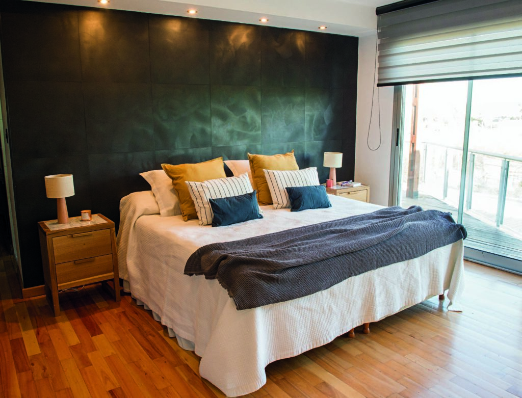 El dormitorio principal tiene una personalidad muy marcada. La pared con revestimiento en placas símil cuero negro que hace de cabecera, transmite absoluta modernidad. Las mesas de luz en madera de petiribí con tapa de mármol embutido, hechas a medida por el equipo de Fortunata Home, agregan calidez al ambiente junto con los veladores de pie de madera y pantalla de tela.