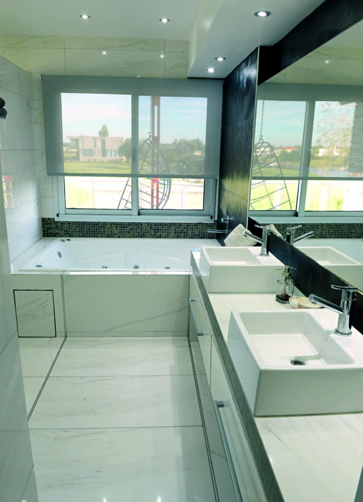 Para los dueños de casa, el baño de su suite es un refugio de relax. Lo componen un mix de materiales (porcellanatos, detalles de venecitas, mesada en símil mármol y pared frontal oscura) que se engaman dentro de una paleta neutra similar a la del dormitorio. Junto a la ventana, el moderno hidromasaje invita a largos baños con vista abierta hacia el exterior.