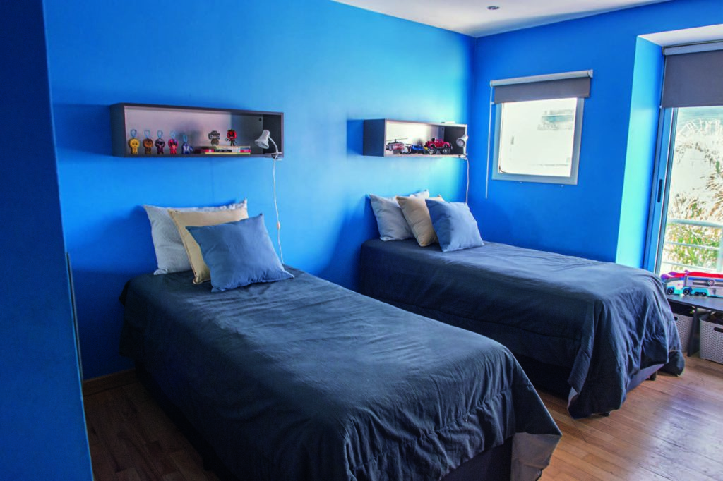 En el dormitorio de los dos hijos varones el color toma protagonismo con el azul intenso de las paredes. “El objetivo era que cada uno tuviera su propio espacio en el escritorio y que pudieran exhibir sus juguetes de colección”, explican las diseñadoras. “Para ello, partimos de una columna central detrás de la cual escondimos los cables y repartimos simétricamente el espacio de apoyo y de guardado hacia ambos lados".
