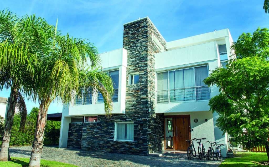 Tanto en el frente como en el contrafrente, la casa recrea un juego de volúmenes que se superponen generando un interesante movimiento. Dos planos verticales revestidos en piedra San Luis aportan textura y hacen más interesante aún el recorrido visual. En el parque trasero, la pileta con borde infinito y solarium húmedo invita a compartir los veranos a la vera del río.