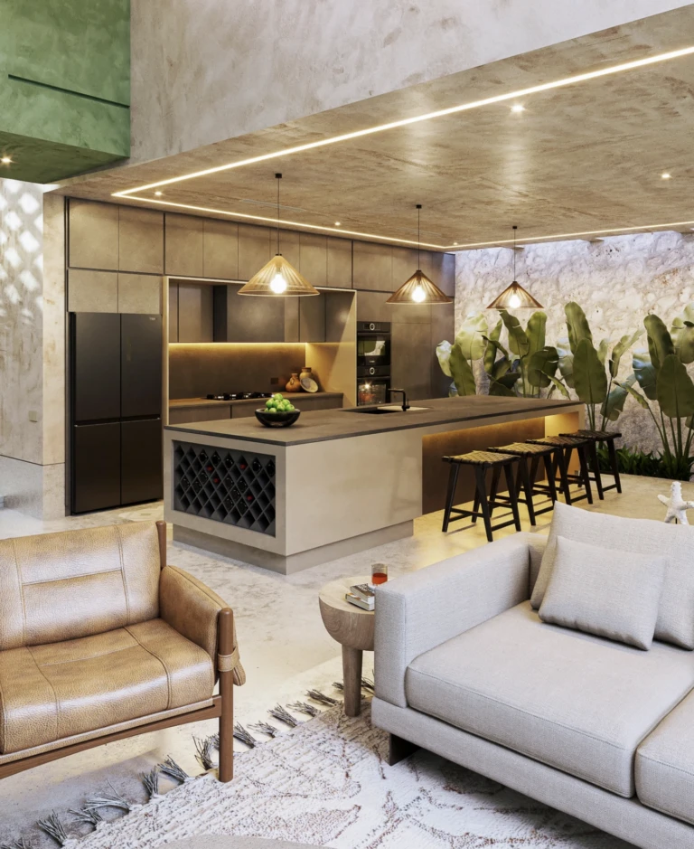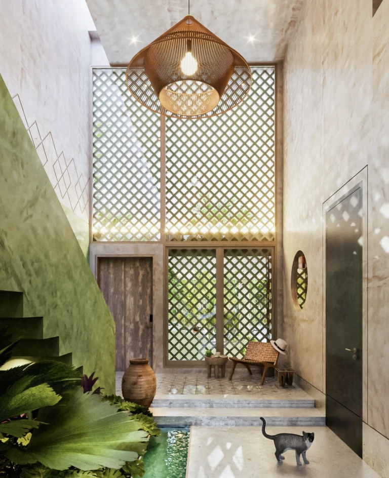 Desde elementos ornamentales como molduras presentes en las casas coloniales del centro de Mérida, hasta celosías inspiradas en las pirámides mayas y acabados característicos como el "chukúm" en diferentes tonalidades, "Casa Canamayté" sintetiza la cultura yucateca en una vivienda residencial.