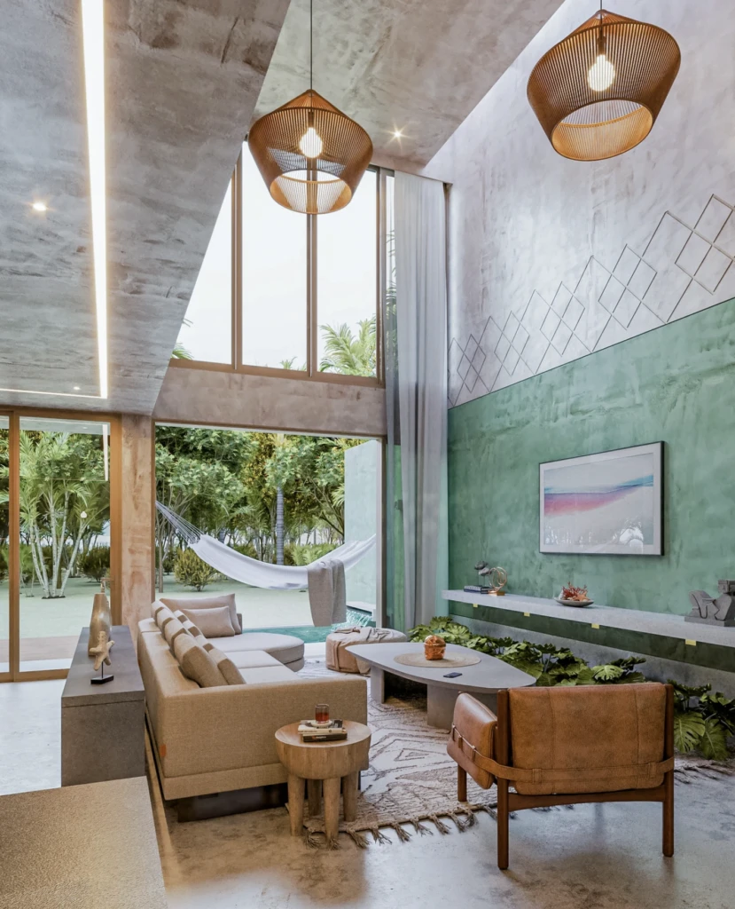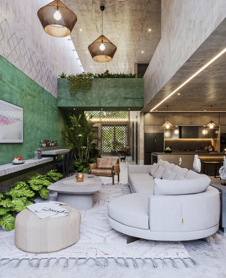 La casa cuenta con un amplio jardín interior que se extiende a lo largo de todo el espacio, convirtiéndose en el enlace entre la naturaleza, la geometría y la arquitectura, creando un entorno fascinante en este proyecto.