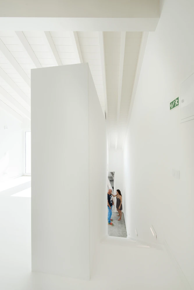 El esquema de la circulación es muy simple. Se basa en espacios abiertos y bordeados por un corte hueco de la escalera, que conecta los tres niveles.