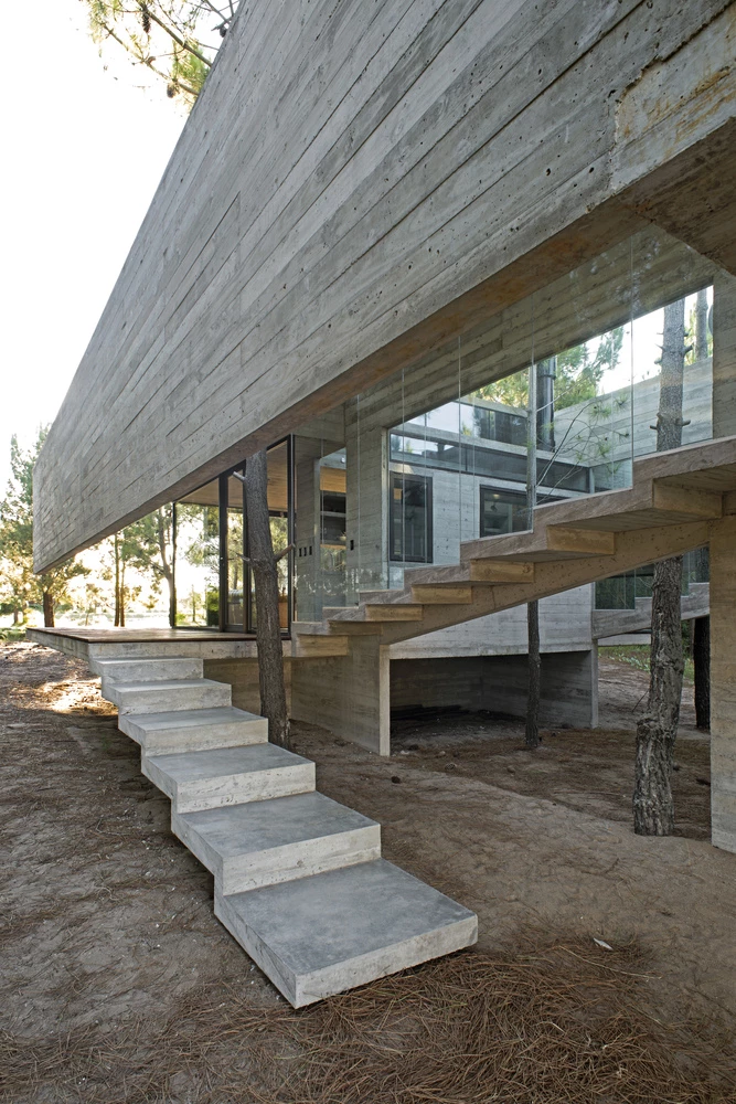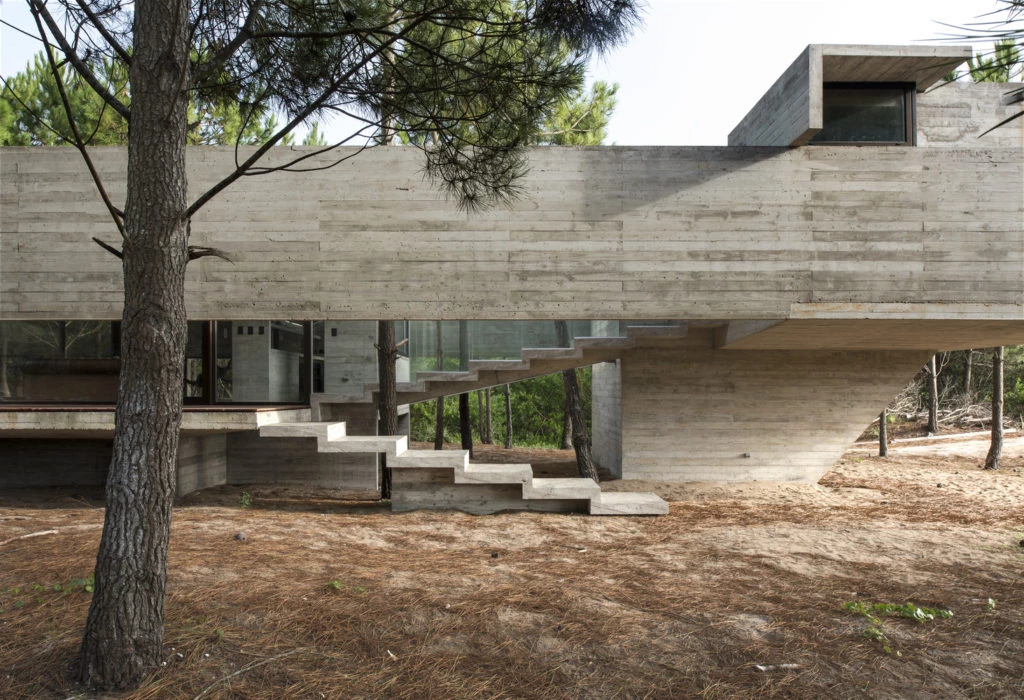 La casa se organiza en dos plataformas escalonadas dispuestas a media altura y conectadas a través de unas escaleras a modo de rampa de suave pendiente y un espacio vacío en el que el pinar se convierte en parte de la casa.