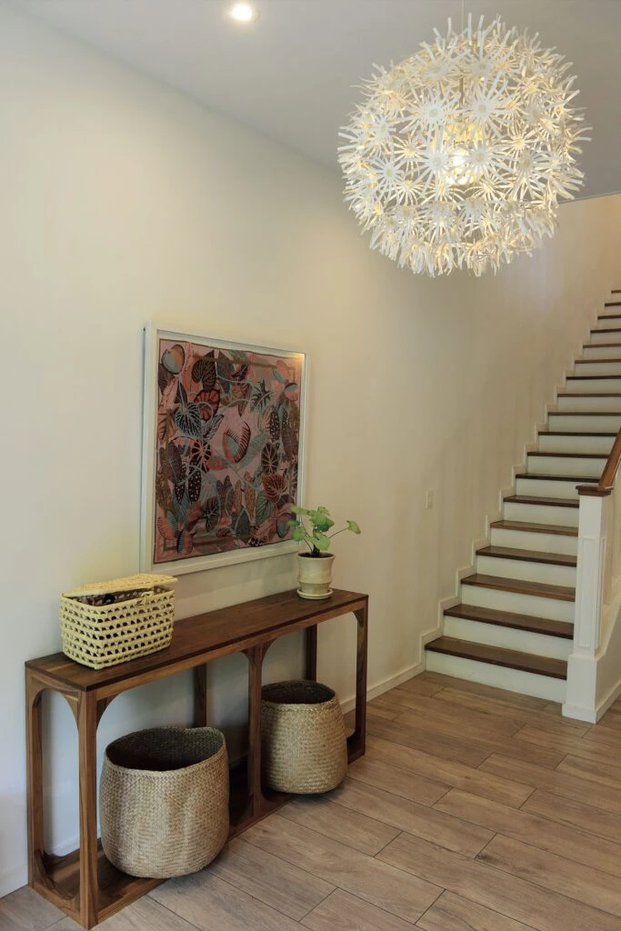 En la entrada a la casa, un mueble recibidor realizado en petiribí (@mgs.interiorismo) hace equipo con dos grandes canastos (@compania_nativa), uno más chiquito para las llaves (@paysanadeco) y un cuadro con pañuelo enmarcado (@francine.oeyen). Todos los pisos de este sector son de porcellanatos modelo Legni Habitat (@ilvaporcellanato) y la escalera tiene pedadas de petiribí.