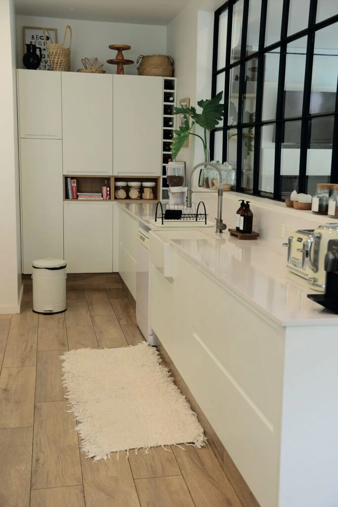 Blanco y negro vuelvan a hacer duo en la moderna cocina, que elige muebles de termoformado de última generación en blanco total, con herrajes ocultos y detalles de madera de petiribí (@johnsonacero_sa) y mesadas de Silestone White storm (@canterasdelmundo).
