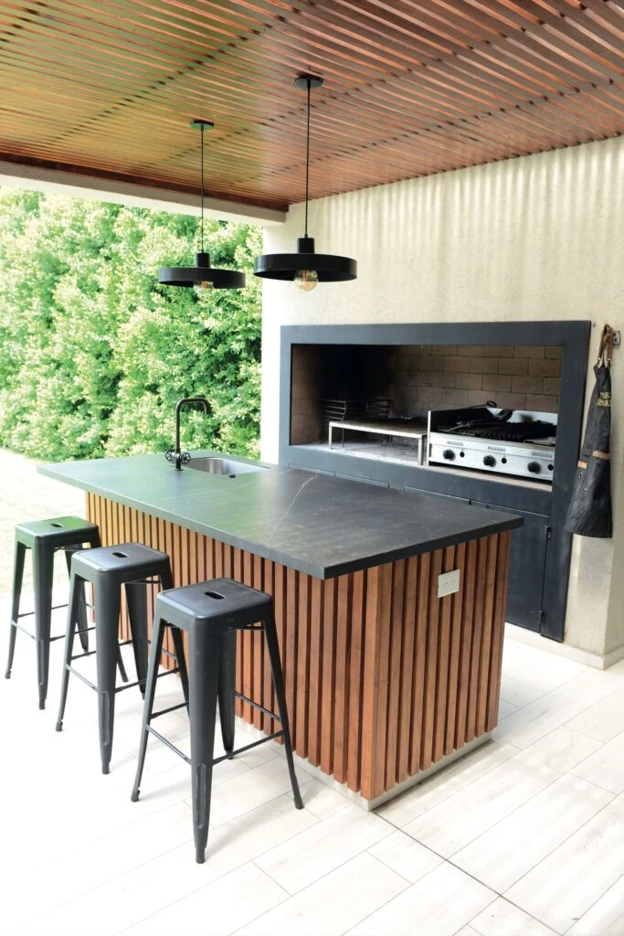 El sector parrilla (a gas y a carbón) se completa con una mesada/barra con tapa de Dekton y base revestida en madera. Lámparas (@dailuminacion).