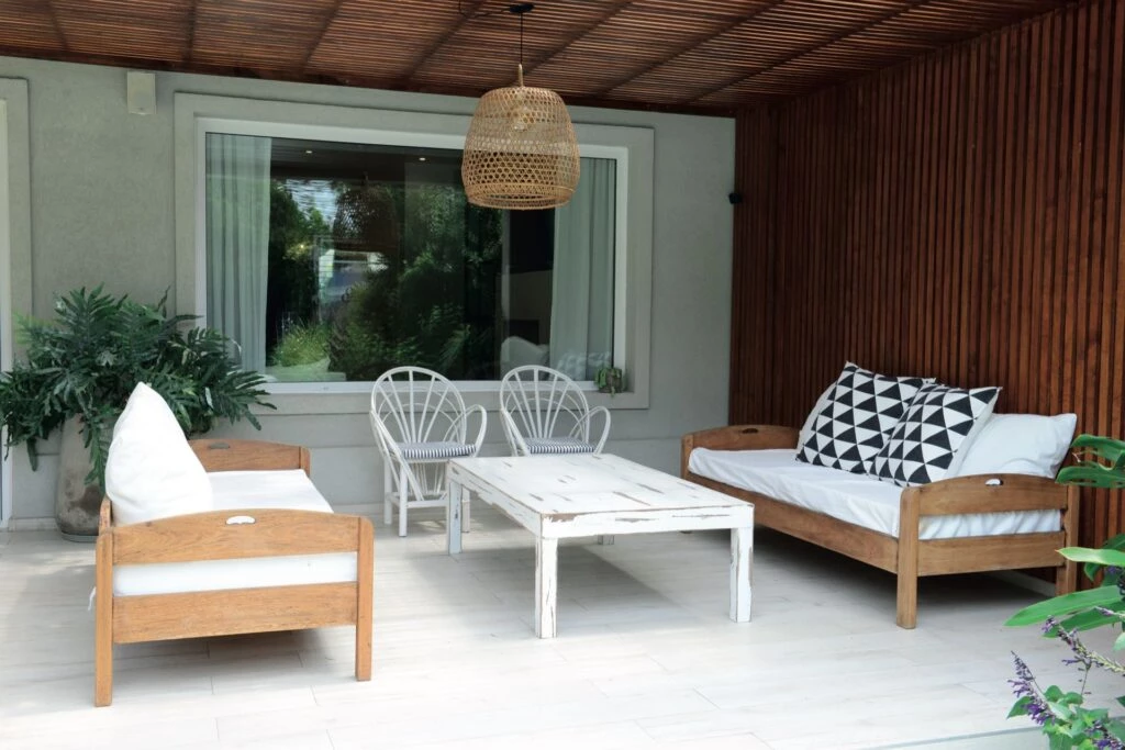 Los camastros del living de exteriores son restaurados: eran camas cucheta donde dormía al dueña de casa y su hermana: “las corté, les agregué respaldo y les mandé a hacer los asientos y almohadones”, cuenta. Los acompaña una lampara de fibras (@compania_nativa) y dos sillas tipo Mar del Plata (compradas en el Puerto de Frutos) y pintadas de blanco.