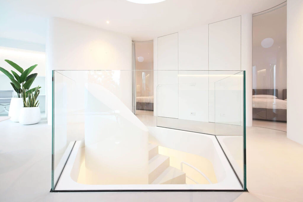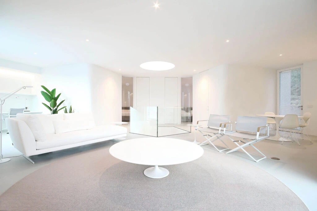 Los interiores están acabados con suelos de hormigón blanco en ambos niveles y paredes enlucidas en blanco, con todos los espacios amueblados en tonos blancos.