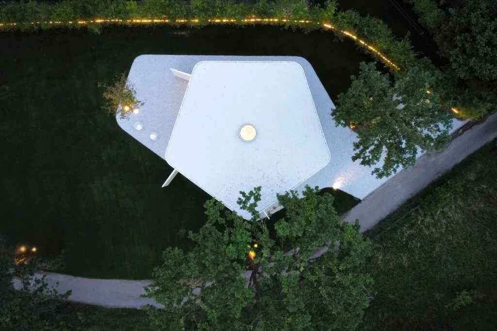 El diseño se ajustó a las limitaciones del retranqueo del edificio y a la necesidad de una zona habitable orientada hacia el valle del lago. Con un lado paralelo a las curvas de nivel de la vertiente y dos lados alineados con las líneas de retranqueo, la sencilla geometría de un pentágono dio lugar a una síntesis de restricciones y necesidades.