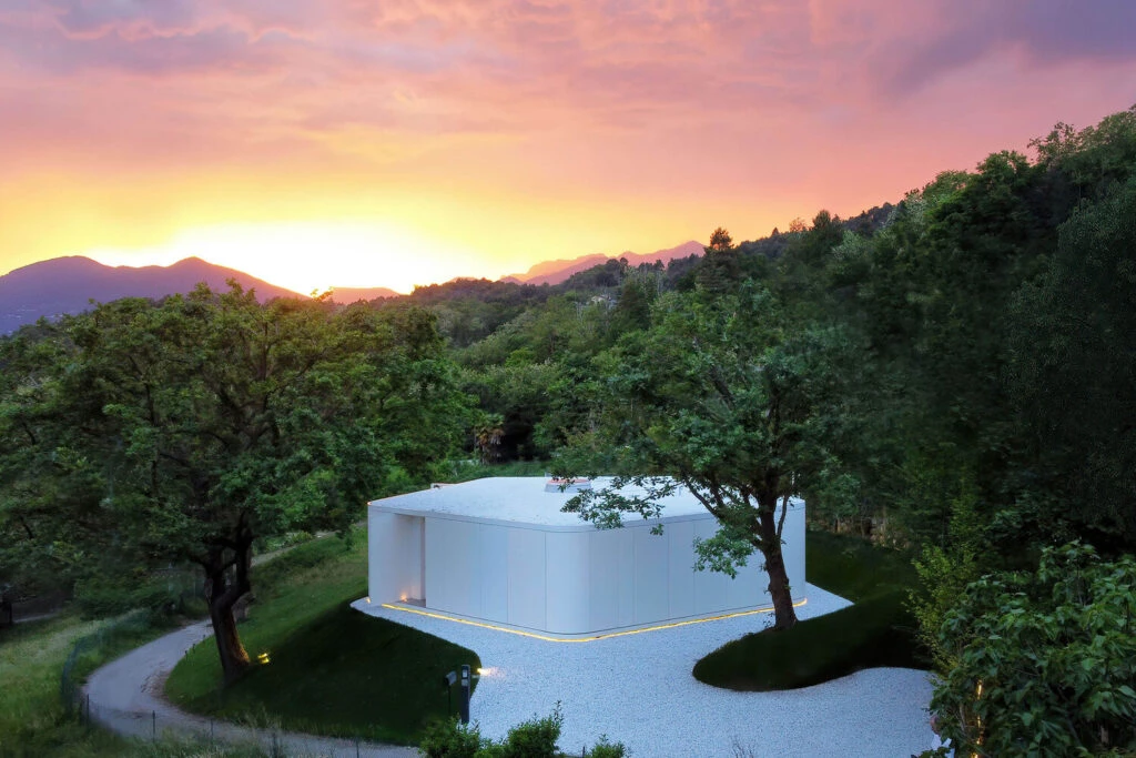 Bautizada "Pinwheel" por el estudio JM Architecture, es una casa prefabricada de madera diseñada a medida y ubicada en las colinas que rodean el lago Mayor (Italia), en un claro de los bosques de robles típicos de la región lacustre limítrofe con Suiza.