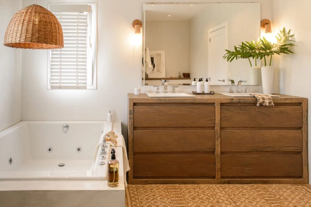Para el baño principal, un mueble de anchico y un espejo de gran tamaño enmarcado por dos apliques de pared. La grifería es de la línea Dominic (FV), con bachas (Ferrum). Una lámpara de fibras cae sobre la bañera con jets. Velas y accesorios varios (@llum.velas , @marcelatelesca y (@rancho_deco). Una alfombrita (@rancho_deco) suma abrigo sobre el piso de porcellanatos Ibirapuera pátina de Portobell (SBG).