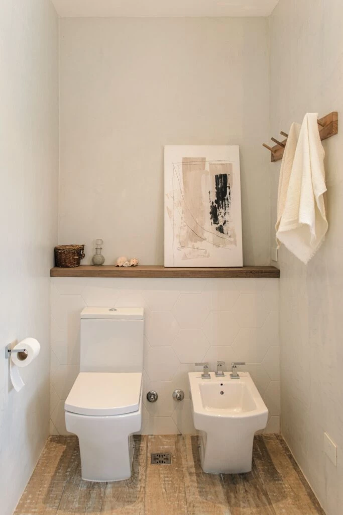 Sobre los sanitarios, un estante con un cuadro abstracto (@jimebecerraart) y un perchero de madera de anchico (@cousy_home).