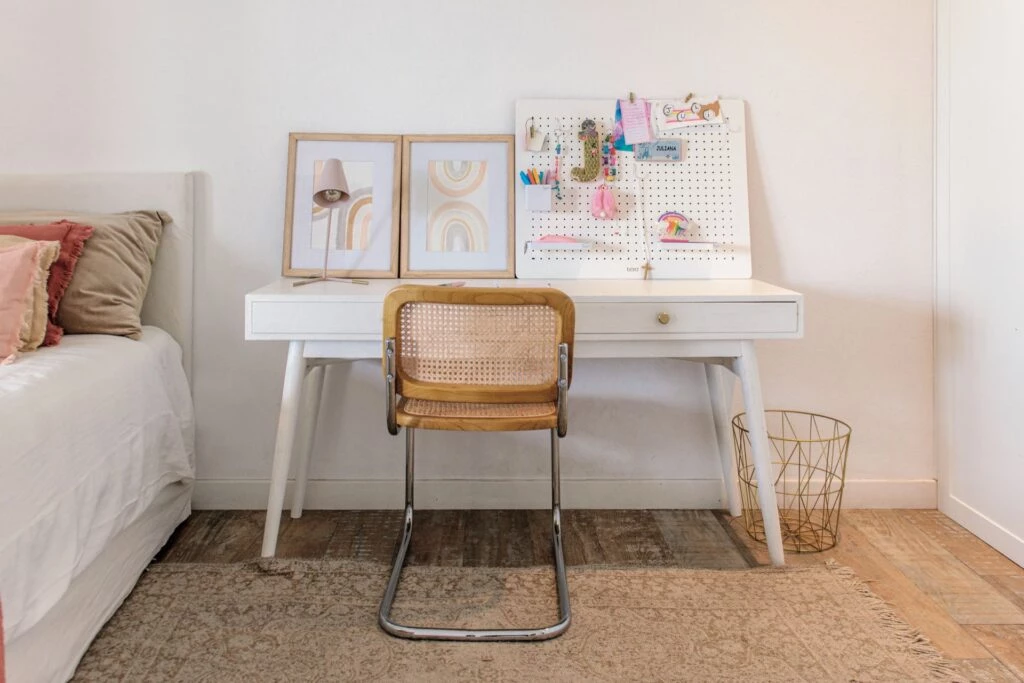 La versatilidad de este espacio permite que por la noche el ambiente funcione como cine para la familia (para poder sumar un proyector y una pantalla automática se proyectó la instalación eléctrica desde la obra) o incluso como espacio para pijamadas, ya que el sillón es en realidad un somier de dos camas. La mesa baja es de maderade kiri blanqueada y el escritorio para dos personas está realizado con caballetes de petiribí, junto a una silla modelo Cipri (@cousy_home).