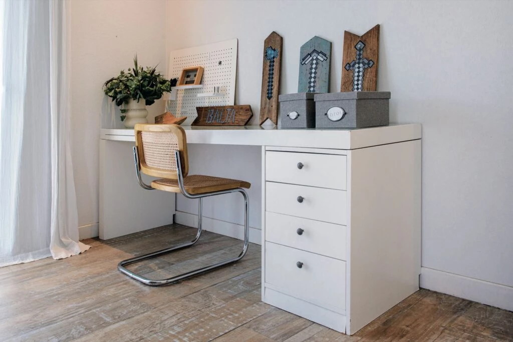 Sobre el escritorio blanco laqueado, una serie de dibujos de Minecraft en madera pintada (@jimebecerraart).