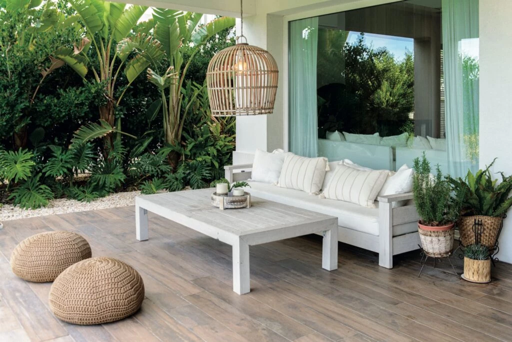 La galería contempla un sector de estar, con muebles en madera de anchico terminados en una pátina arena junto a una pareja de pufs de sogas náuticas y un comedor de exteriores presidido por una mesa de comedor bien robusta, con bancos laterales de madera de anchico y sillas de rattan.