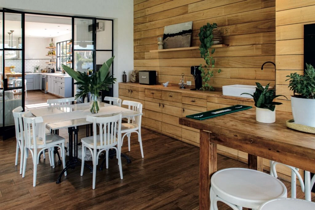 Revestido con un entablonado horizontal de madera de kiri, el quincho suma mesa y sillas Thonet heredadas que la dueña de casa pintó de blanco hueso.