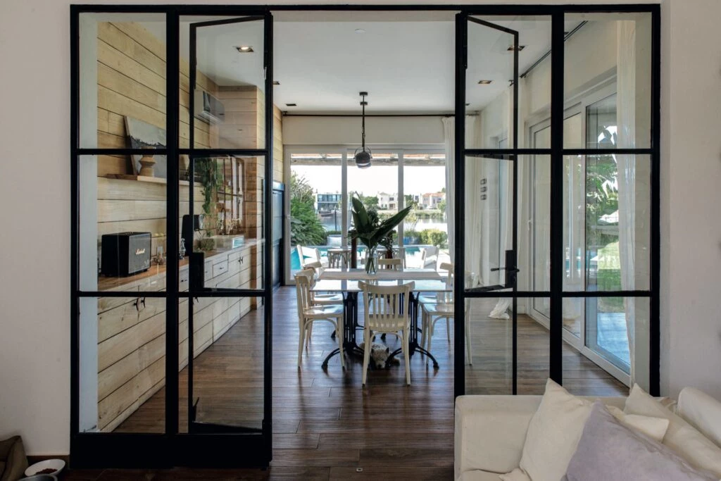 Por eso se diseñó esta suerte de quincho cerrado y acondicionado, ubicado a continuación de la cocina y en línea con la galería, que cuenta con un amplio ventalal de tres paños que se pliegan para abrir aún más el espacio.
