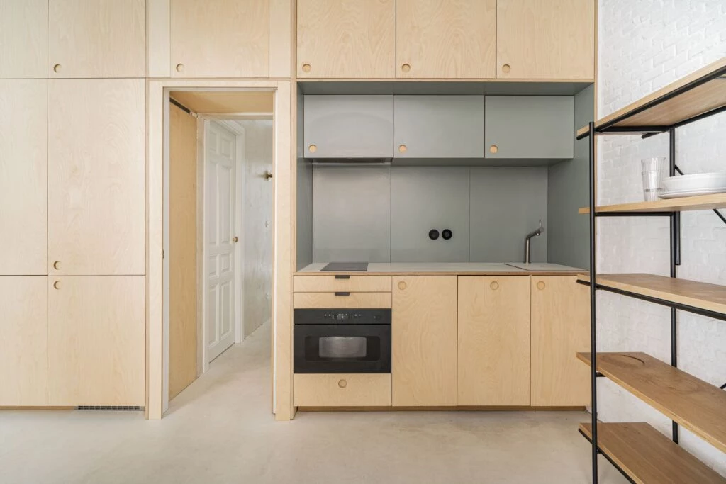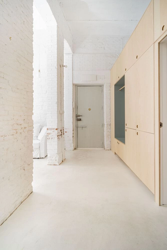 Intencionadamente, ese nuevo muro equipado tiene 2,70 m de altura y no llega hasta los 4 metros del techo, lo que garantiza la continuidad espacial en el techo. De esta manera no se pierde el concepto de contenedor vacío.