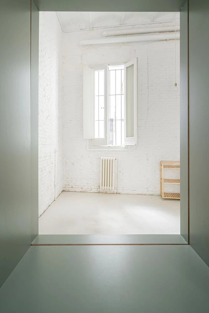 Una vez vaciada, se ordena el interior mediante un único elemento a modo de muro equipado. Esta única pieza se coloca ligeramente girada respecto a los muros medianeros principales. Con este gesto se consiguen dos cosas: ampliar la zona pública de la casa y hacer de frontera entre lo público y lo privado.