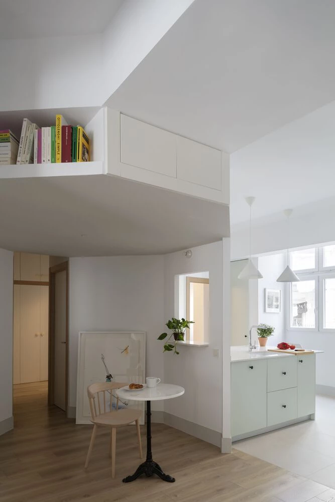 La ventana pasaplatos, entre la cocina y el octógono, hace que este espacio ambiguo se convierta en una extensión de la cocina, permitiendo desayunar o tomar una copa de vino a ambos lados de la ventana.