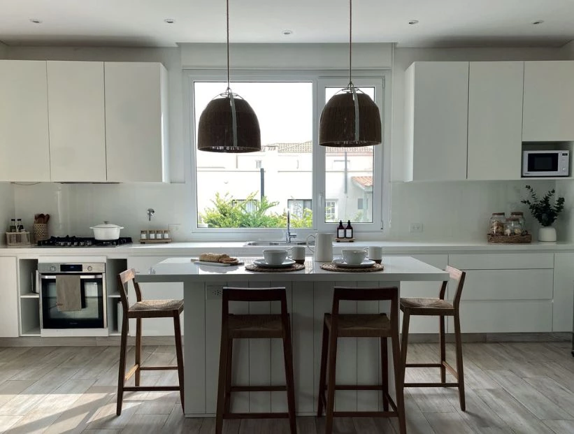 La cocina integrada puede mantenerse abierta o cerrada mediante unas puertas corredizas. Todo se unificó con el blanco laqueado de sus muebles -tanto en bajomesada como alacenas- y el de las mesadas, en cuarzo blanco. La isla central se diseñó en MDF ranurado y laqueado, con mesada de cuarzo turco blanco. Sólo las lámparas, de fibras naturales (@rancho_deco) y las sillas altas de madera (@pasto_home), imponen contraste.