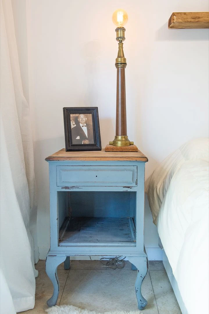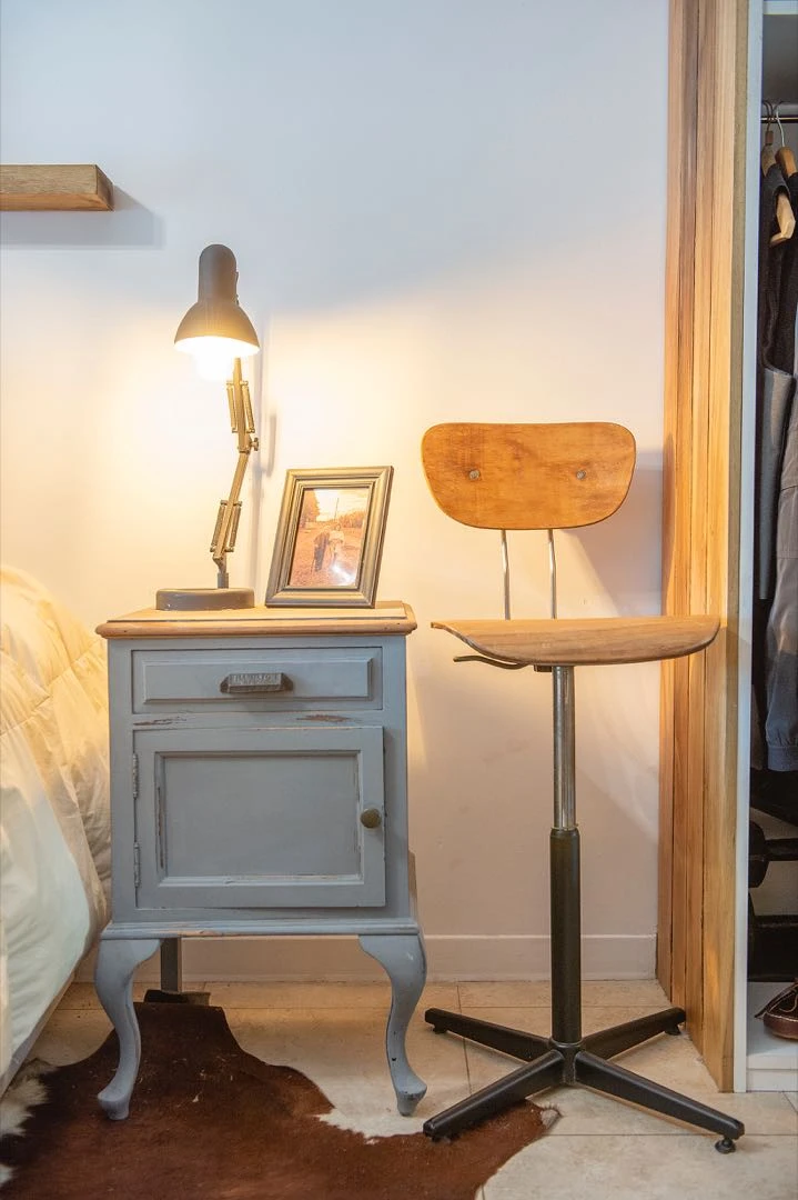 Las mesas de luz son antiguas, compradas en remate, y se pintaron en un tono de gris que respeta la colorimetría del resto del departamento. El velador negro es heredado y el otro se armó con un mango de bombero electrificado.
