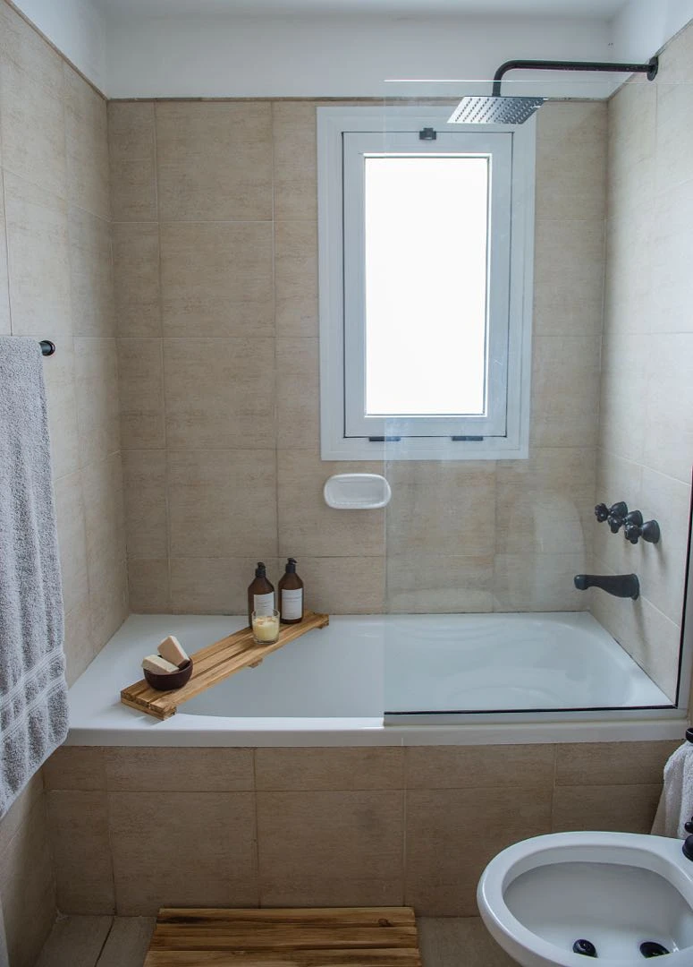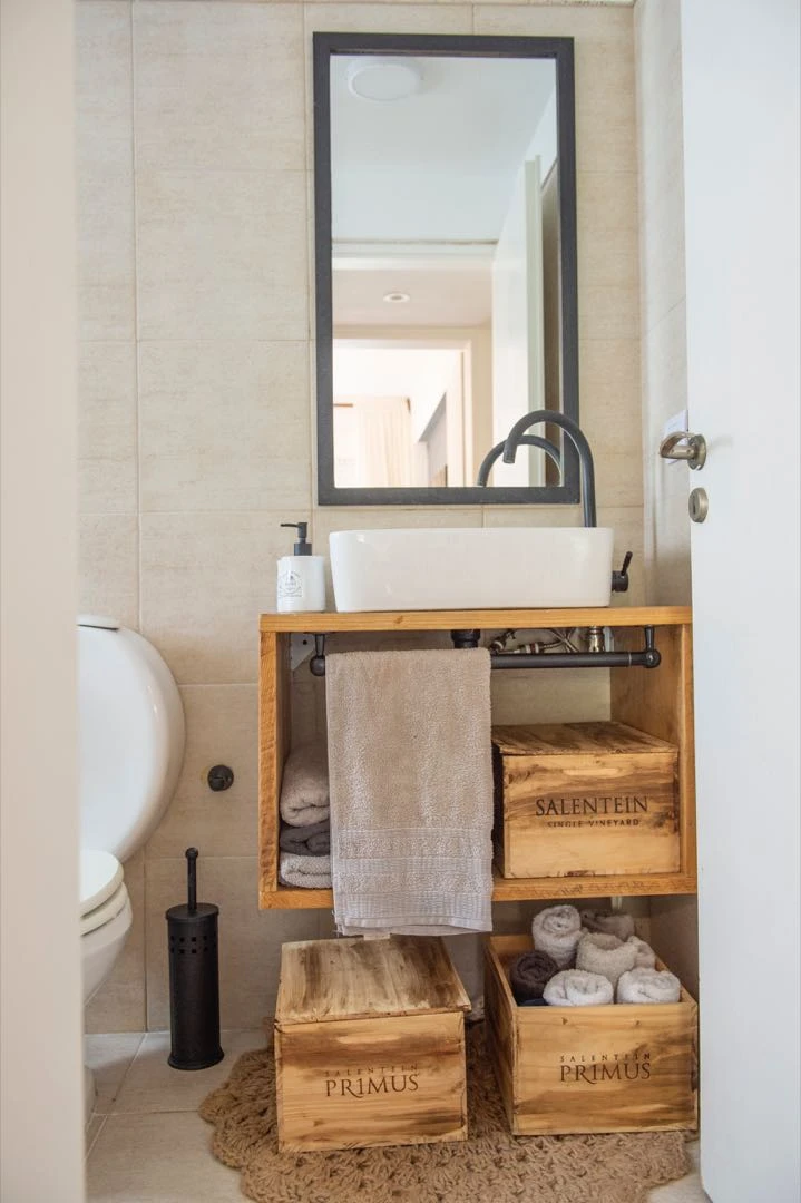 En el baño sólo se optó por reemplazar el vanitory original por un mueble de kiri tipo cubo abierto (@modulzeta) con una bacha de apoyo (@ferrum) y grifería de lado (@griferiapeirano). Unas cajas de vino de madera se reutilizaron como espacio de guardado. La alfombra de yute redonda fue tejida por su hermana Sabrina (@casa_pastel). Cruce de bañera (@minadecohome) y dispenser (@cableatierraanita). El espejo y las griferías de bidet y bañera se pintaron con aerosol negro.