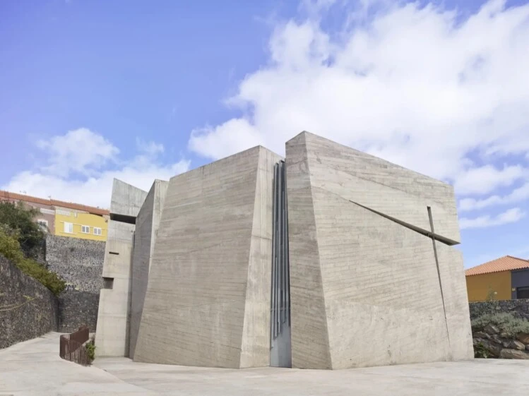 Su autor, el arquitecto Fernando Menis, creó un templo que parece surgir directamente de la tierra volcánica de la isla: cuatro volúmenes macizos que se elevan como rocas movedizas, rugosas, imperfectas y profundamente poéticas.