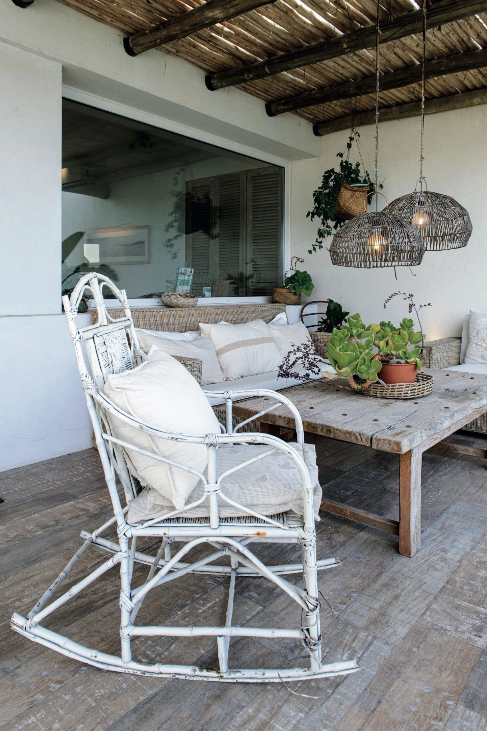 La galería contempla un sector de estar, con muebles en madera de anchico terminados en una pátina arena junto a una pareja de pufs de sogas náuticas y un comedor de exteriores presidido por una mesa de comedor bien robusta, con bancos laterales de madera de anchico y sillas de rattan.