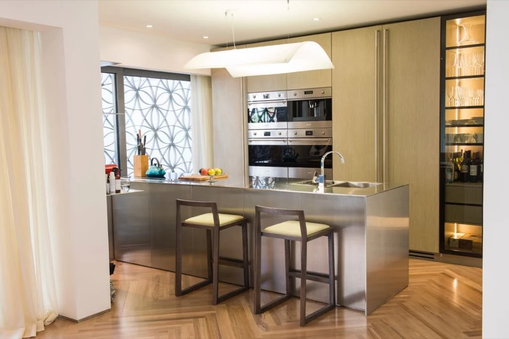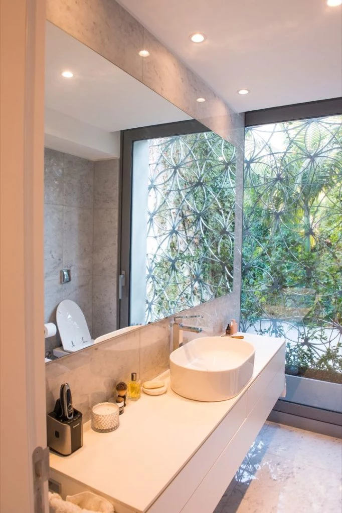 Pero también aquí lo que sorprende es la trama de metal que se cuela por los grandes ventanales, sumando protección y privacidad pero sin interrumpir el paso de luz natural.