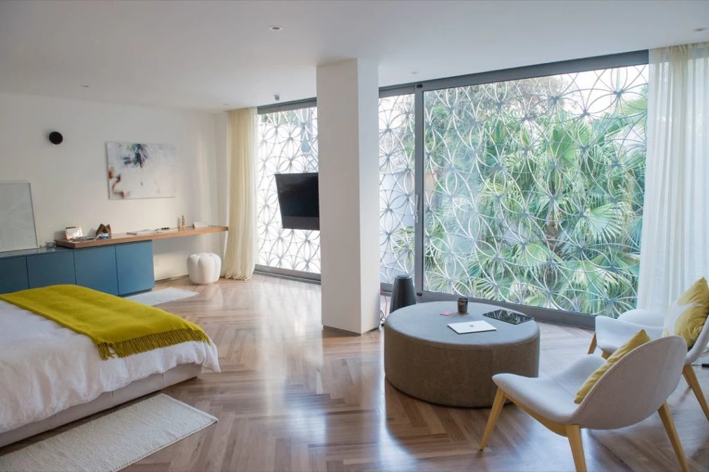 En el dormitorio principal, que da al contrafrente de la casa, la escultórica malla exterior con su trama orgánica se cuela por el ventanal corredizo que va de piso a techo y se repliega por completo hasta quedar escondido dentro de los muros laterales. De este modo, permite un contacto directo con la naturaleza.